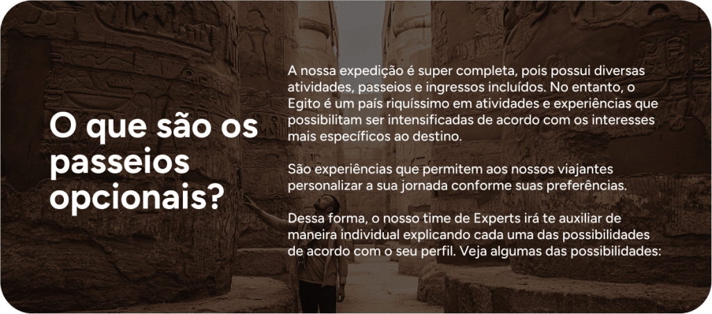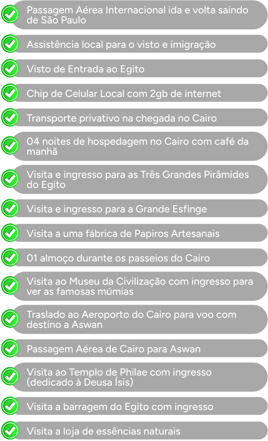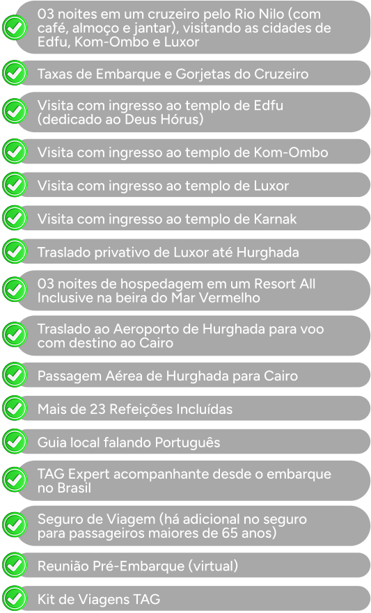 Serão 12 dias inesquecíveis por templos milenares, paisagens desérticas, cruzeiro pelo Nilo e experiências que vão marcar para sempre sua memória.